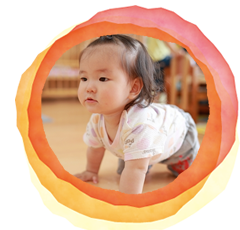 離乳食の進め方、睡眠、身体発達に合わせた働きかけを家庭と共に育て合っています。 特定の大人との信頼関係が作られていく中で、わらべうたあそびなどを通して言葉や人との関わりや好奇心が芽生えてくるようにしていきます。