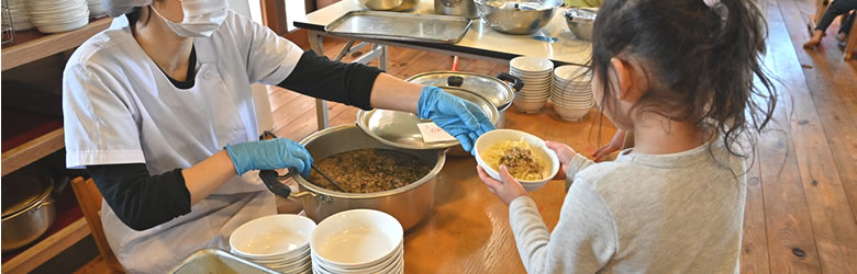 ひらお保育園では『たべることは育つこと』をねらいに、手作りで美味しい食事を提供しています。食品添加物には特に注意しながら、国産の食材を中心に使用し、旬の食材を活かす手作り給食を提供しています。