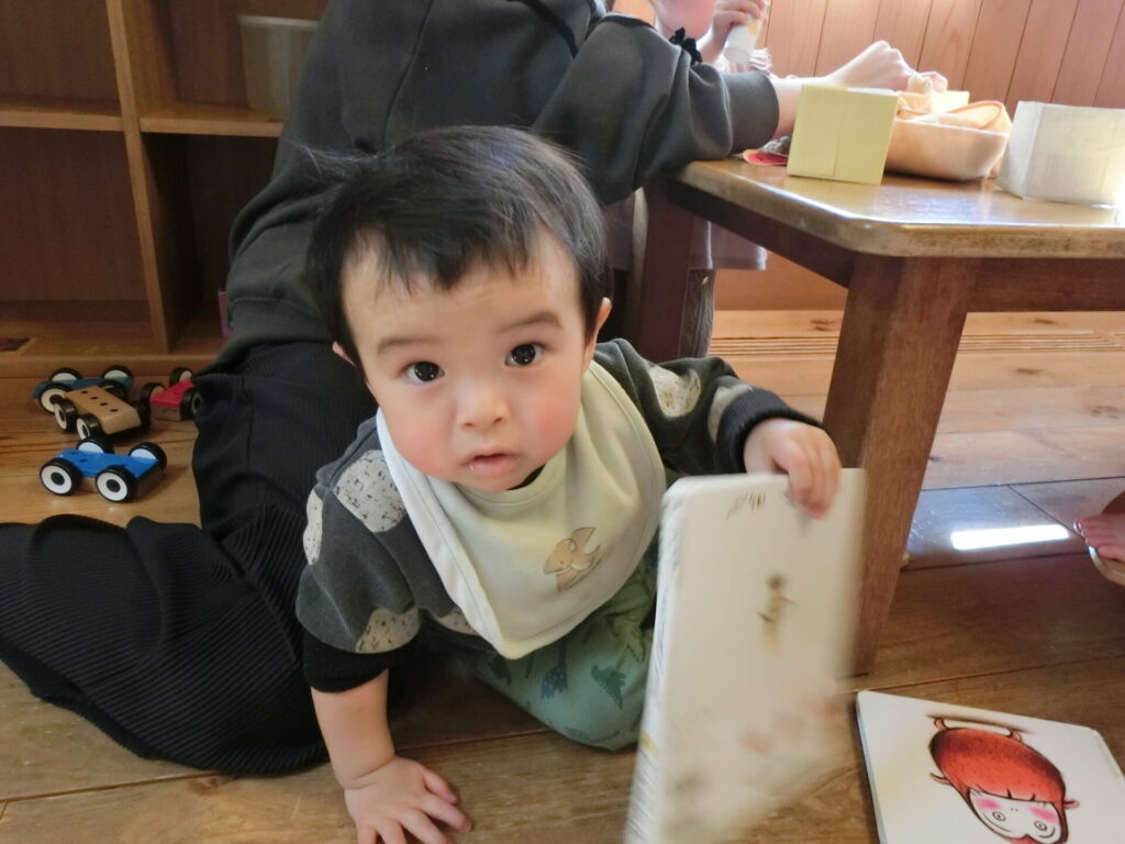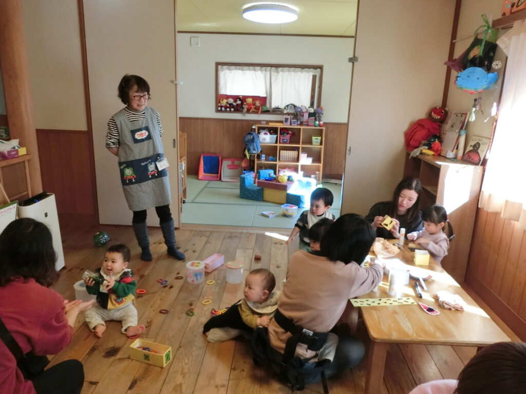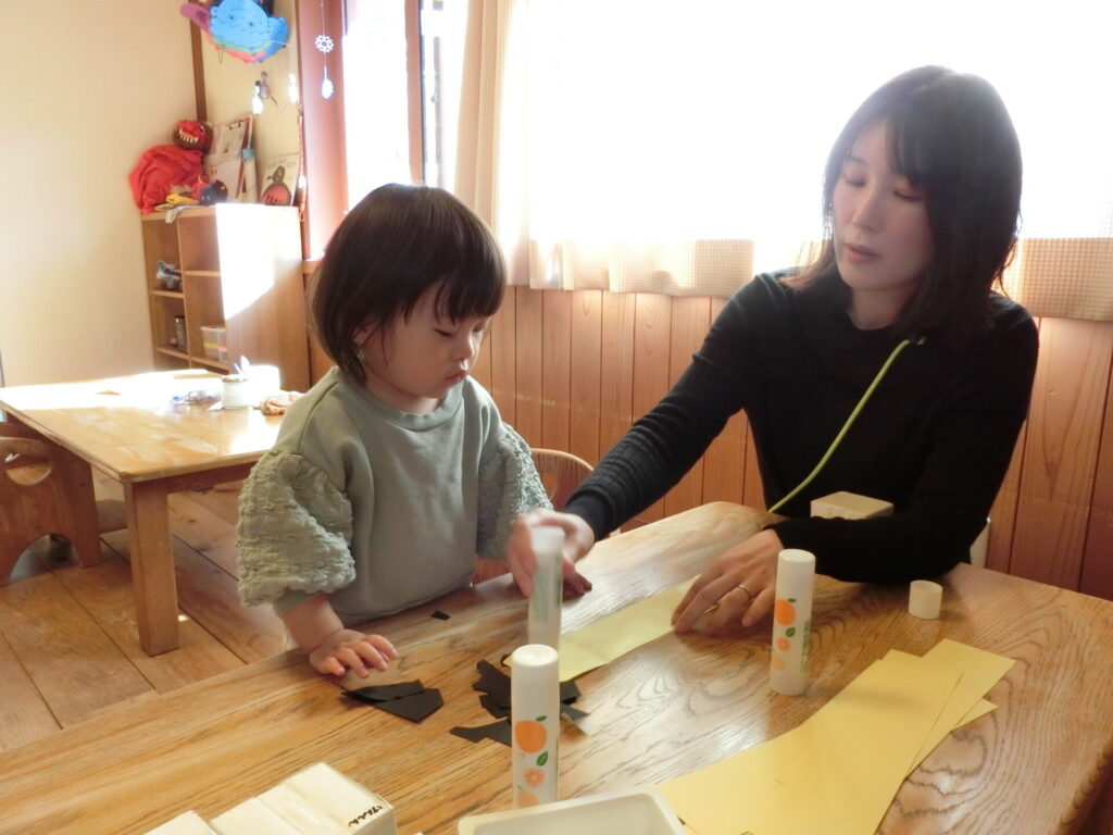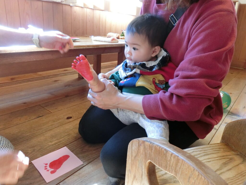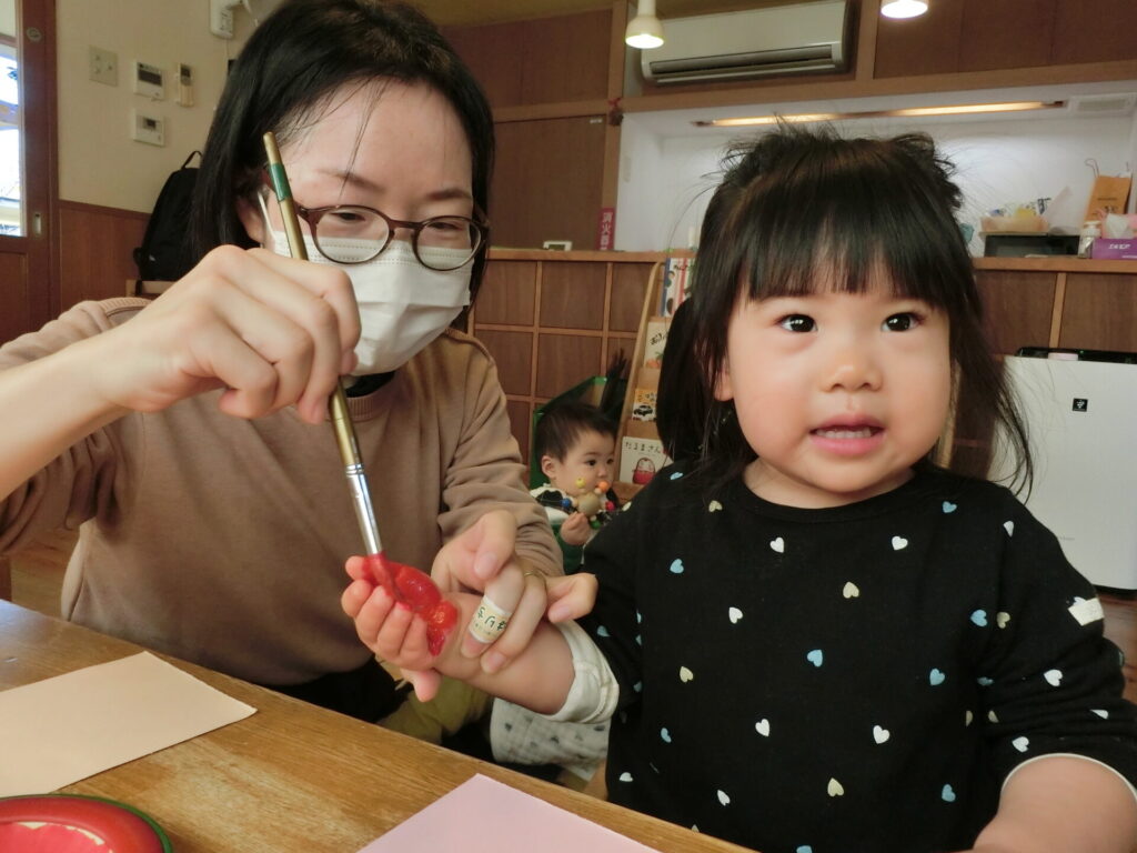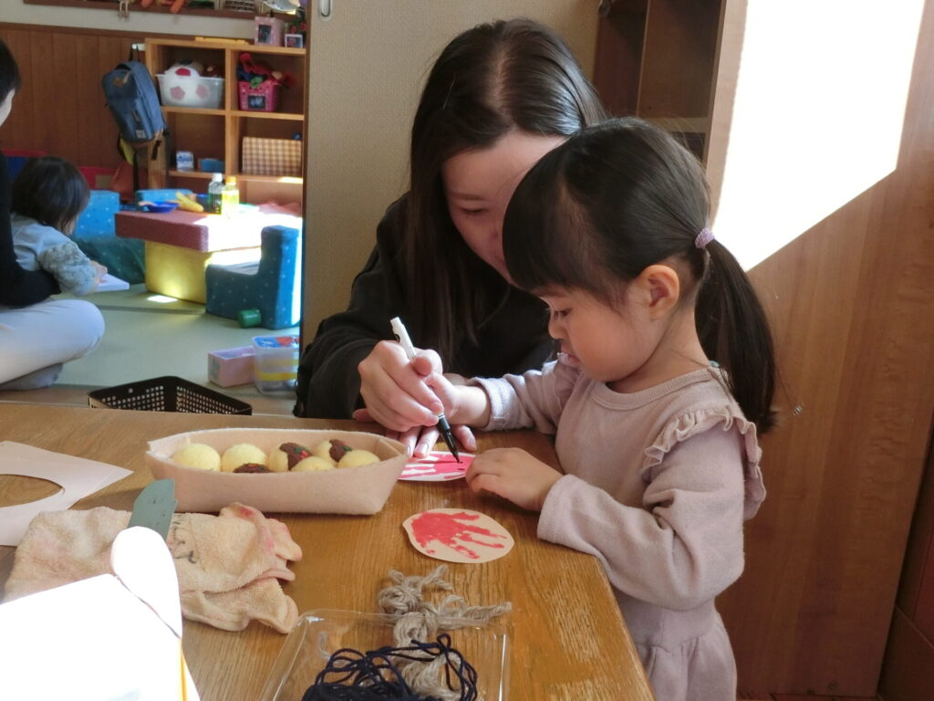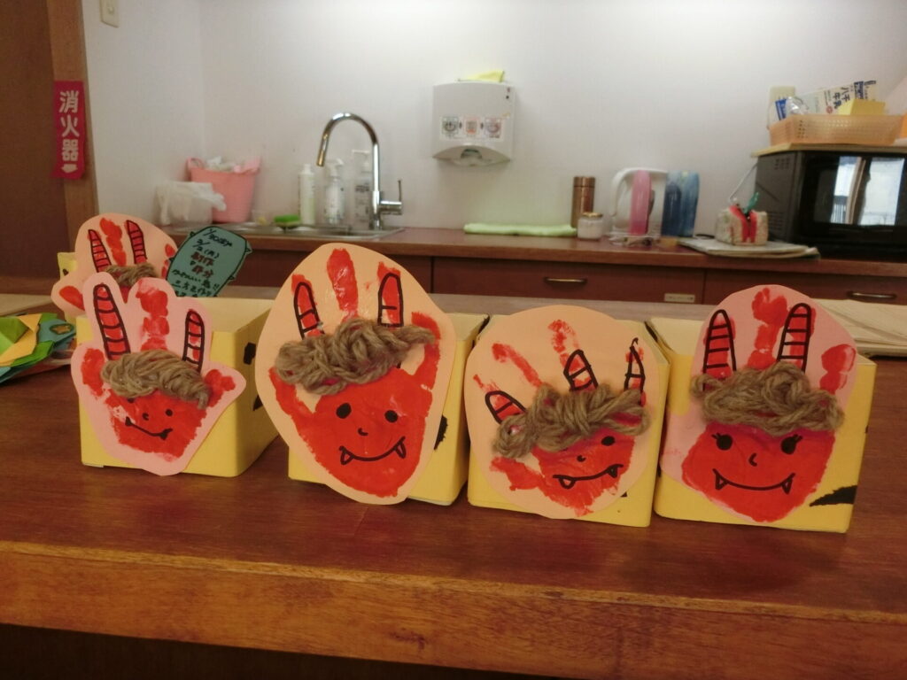 2日(月)制作 節分を行い、子どもの手形・足形をとり可愛い鬼を貼った、豆まきに使う『三方』を作りました。今回は、絵の具を使い筆で塗りました。筆が少しくすぐったい子もいたようですが、お母さん達も慣れてきていて上手に塗っていました👣✋ そして可愛い鬼の三方ができました👹