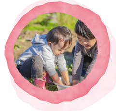 保育者との関係から子ども同士の関係へと広がり、遊びも発展していくように働きかけていきます。 身体面でも大きく発達する時期なので、指先の遊びから全身を使って楽しめる遊びまで工夫しています。また、身の回りのこと(食事・排泄・着脱)も自分でできるように援助していきます。